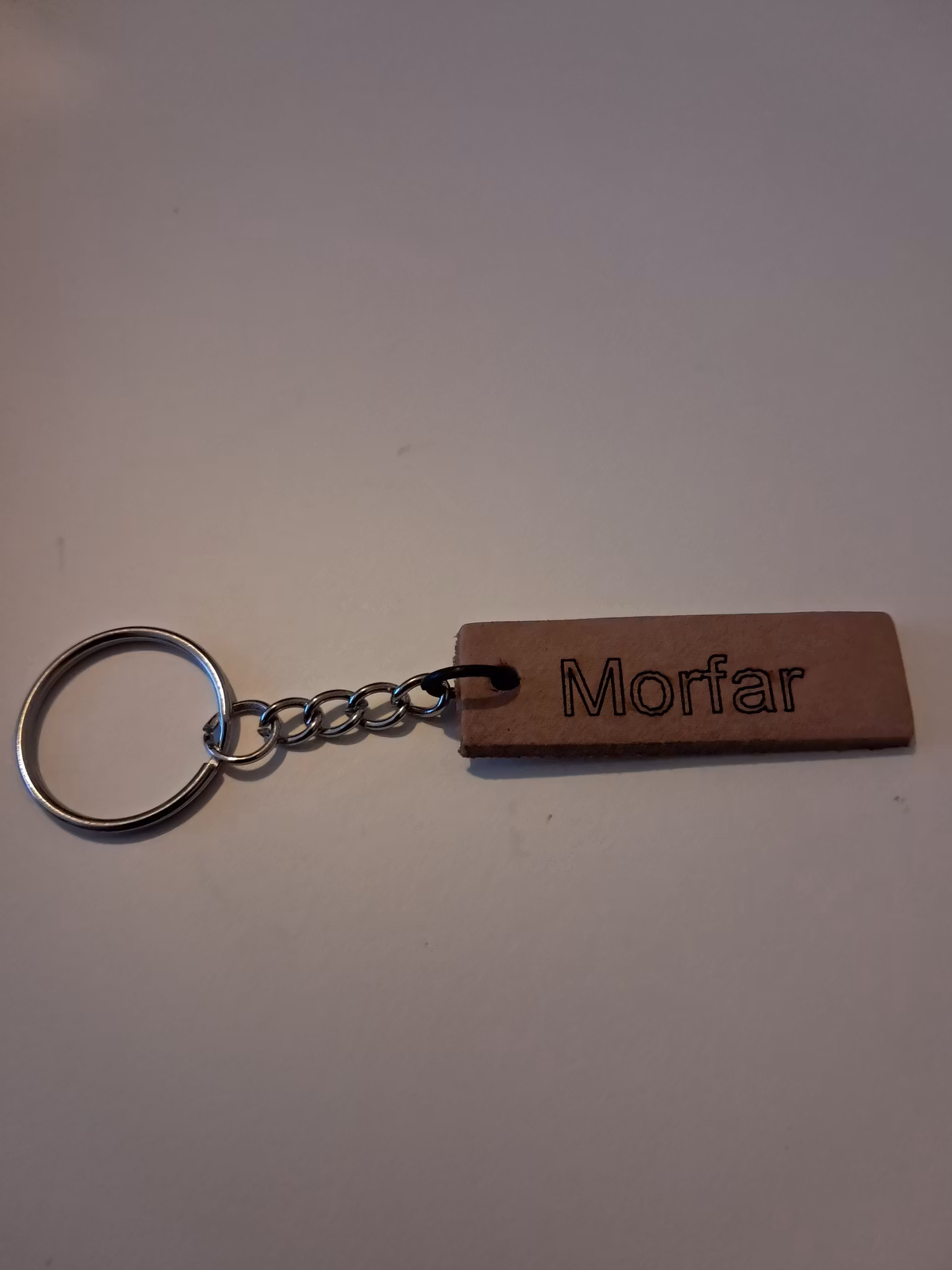 Nyckelring med FarfarMaterial:läder Läderbiten är ca 5× 1,5 cm och mellan 2- 4 mm tjock Viss nyansskillnad kan förekomma Om man önskar valfri tex