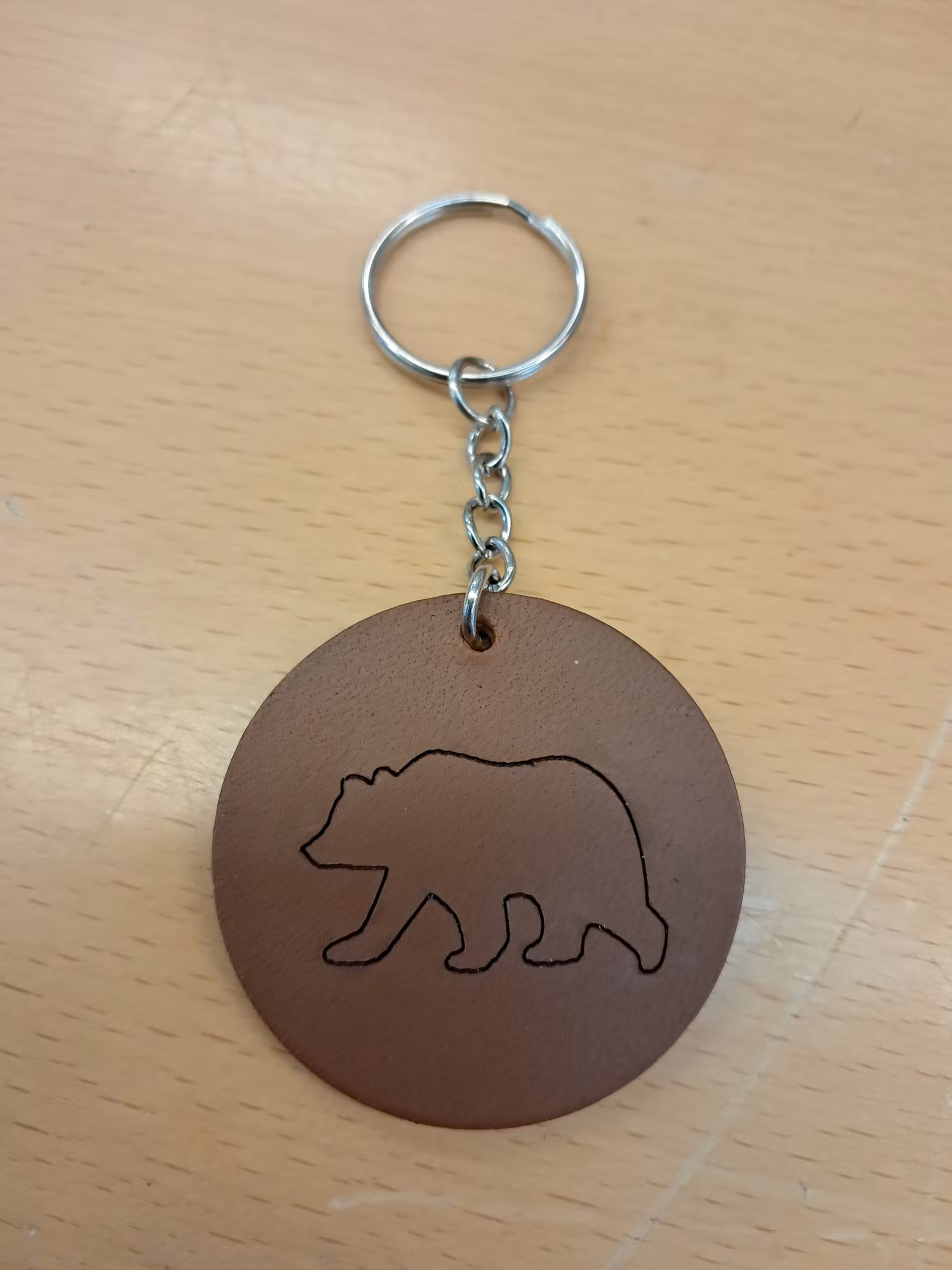 Rund nyckelring med björn Material: läderLäderbiten är ca 5 cm i diameter och mellan 2 - 4 mm tjock